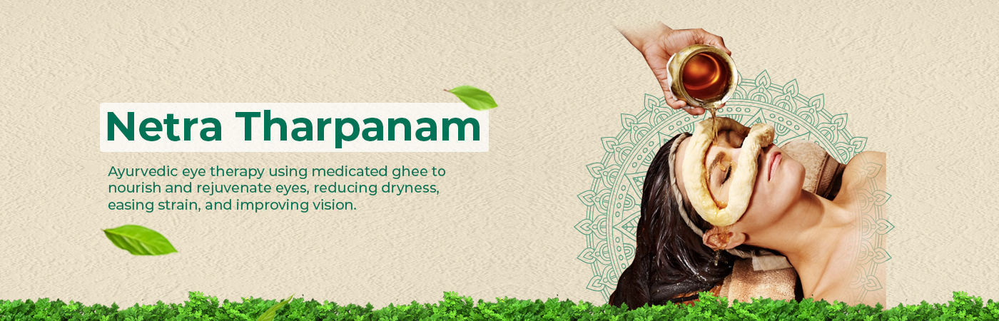 Netra Tarpanam is an Ayurvedic eye care therapy that involves nourishing and rejuvenating the eyes using medicated ghee (clarified butter) or oil. In Sanskrit, "Netra" means eye, and "Tarpanam" refers to nourishment or saturation. During Netra Tarpanam, a dough ring is created around the eyes to hold the medicated ghee or oil. The eyes are then gently bathed in the soothing liquid, allowing the healing properties of the medicated substance to penetrate deeply into the eye tissues.